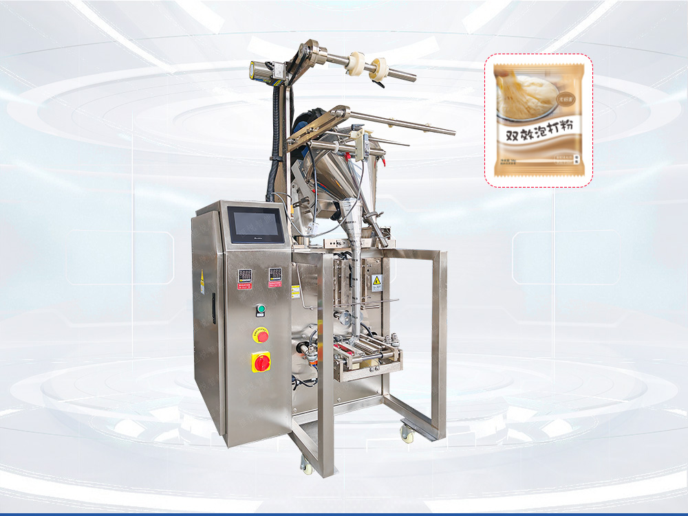 食品粉剂包装机通常用具有流动性的粉状散料产品的自动计量分装,如莲藕粉、泡打粉、白凉粉、固体饮料、代餐粉混合料等产品的小袋包装,采用HY/300系列小型粉剂食品包装机可以很好的解决常规粉末包装机下料不畅卡料漏粉的问题。